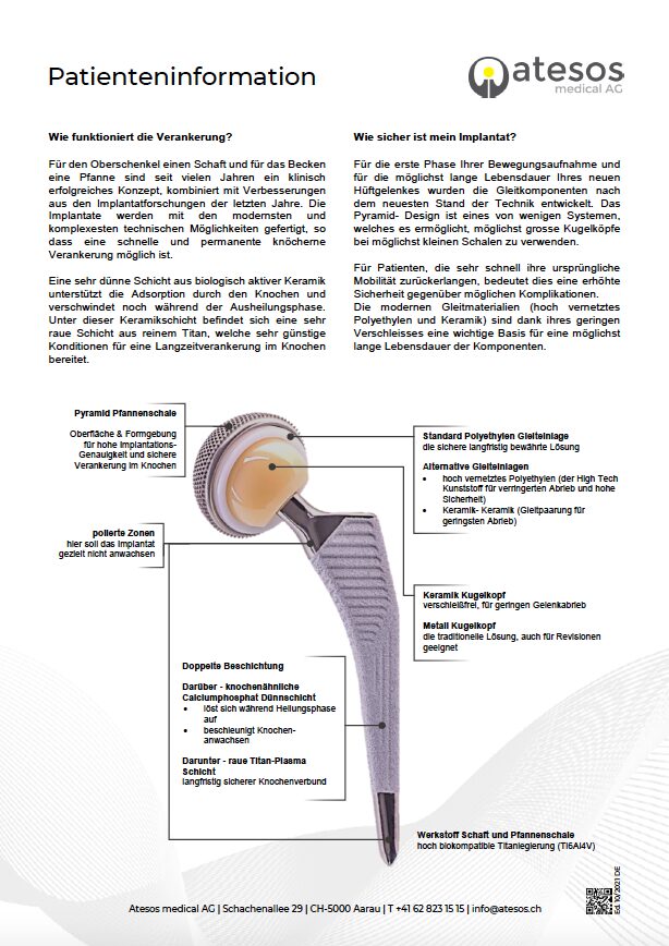 Wichtig für den langfristigen Erfolg der Operation sind auch die zur Anwendung kommenden Implantate und das implantatspezifische Instrumentarium. Setzt der Chirurg ein Implantat von Atesos ein, erhalten Sie ein qualitativ sehr hoch stehendes Produkt.